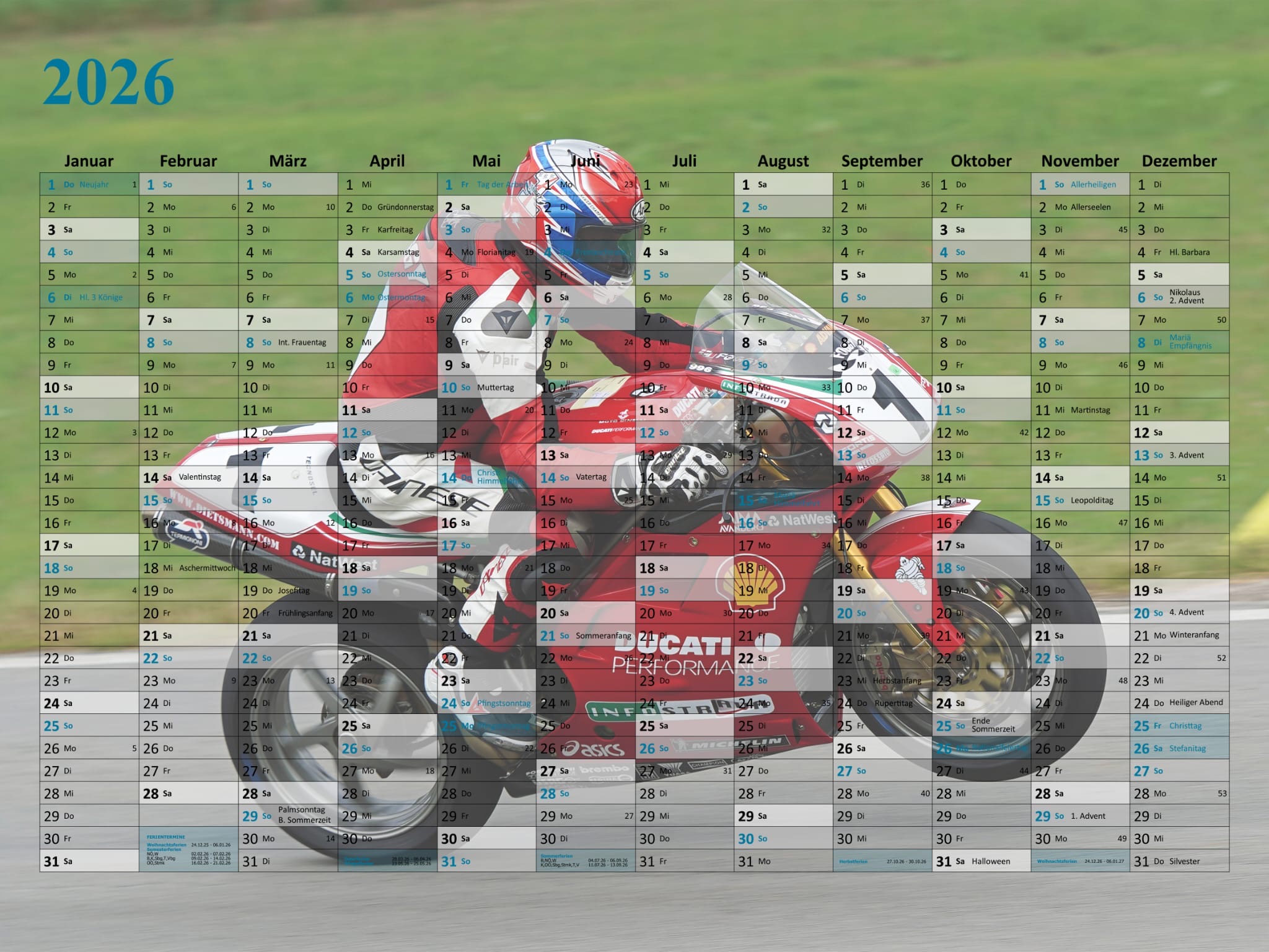 Erich Müllegger, unser unermüdlicher Fotograf und LAVERDA und GUZZI Fahrer, hat wieder einen schönen Kalender mit LAVERDA Fotos zusammengestellt und zusätzlich einen mit italienischen Motorrädern und einen 1-Blatt Kalender mit Carl Fogarty in Schwanenstadt. Erichs Kalender 2026 könnt ihr euch hier herunterladen und selbst ausdrucken oder fertig gedruckt bei Wolfgang Huber kaufen. Damit könnt ihr eure Werkstatt schmücken, euren Arbeitsplatz verschönern oder eure Freunde beschenken. Herzlichen Dank an Erich!