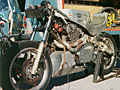 The Non-Frame-Racer built in 1976 did not have a conventional frame. The anterior auxiliary frame was mounted to the cylinderhead and the engine-mounts, the second auxiliary frame consisted of aluminium plates and was bolted to the back of the triple engine cases! A monocoque made from riveted aluminium, the fuel tank below the engine, high pipes and a sensationally low weight were discerning features of this bike.